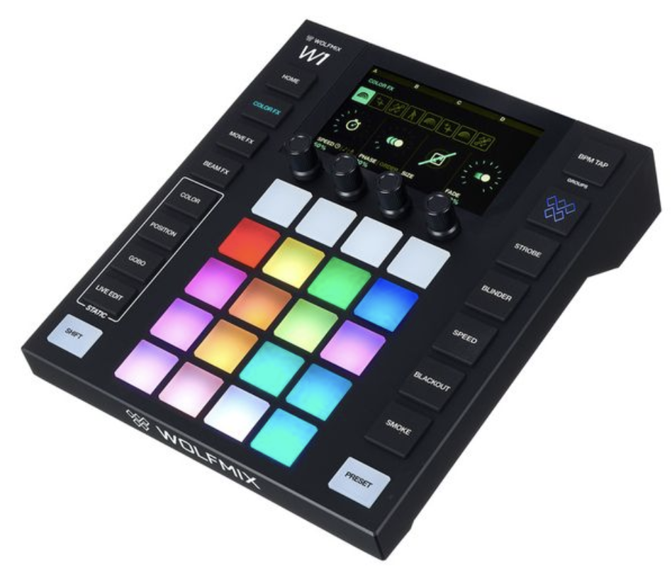 Der Wolfmix W1 (Mk2) ist ein leistungsstarker, eigenständiger DMX-Lichtcontroller, der ohne Computer funktioniert und speziell für Live-Performances entwickelt wurde. Das kompakte Hardware-Gerät vereint intuitive Bedienung über einen 4,3″-Touchscreen und 37 RGB-Silikontasten mit integrierten Effektgeneratoren für Musiksynchronisation.